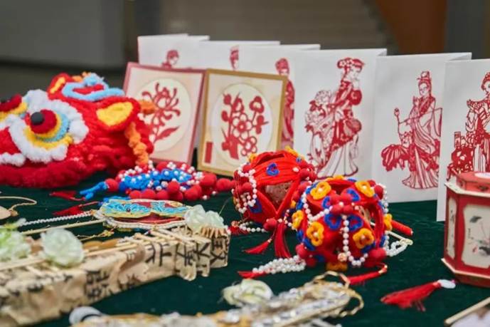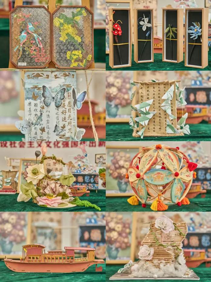 观展过程中,王利蕊对作品的设计理念、呈现形式和创作特色进行详细地介绍。她谈到,本次展览围绕课程第十章《建设社会主义文化强国》,包含“纸鸢裁春•灯火相传”“非遗薪火·守艺中国”“墨脉千年·画说时代”等系列主题,让学生根据专题知识,运用手工作品、微视频、绘画等具体形式进行创作,使文化认同深深扎根于学生心中。